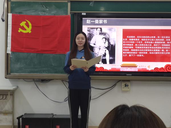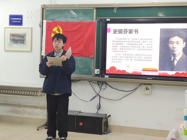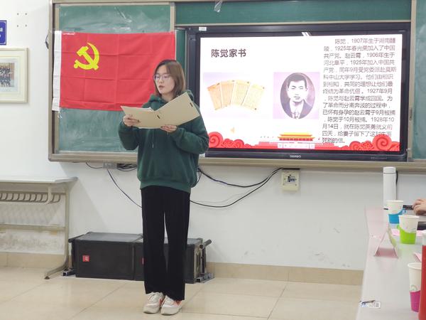 活动中,耿子玥、江雨奇、唐冰如三位同学先后诵读赵一曼、史砚芬、陈觉三位同志的红色家书,并分享自己的感想。同学们表示,陈觉同志的家书表达了一个革命者大无畏的牺牲精神以及对至爱亲人的无限深情;史砚芬同志的家书字里行间表达了对共产主义美好理想的向往和对信仰的坚守,以及为革命不怕牺牲的顽强意志;赵一曼同志的家书展现了她面对国家前途和民族大义,“誓志为人不为家”的英勇抉择。支部成员们无一不为之动容,纷纷表示要学习、传承革命先辈百折不挠的精神,进一步坚定理想信念,努力学习专业知识,为共产主义事业奋斗终身。