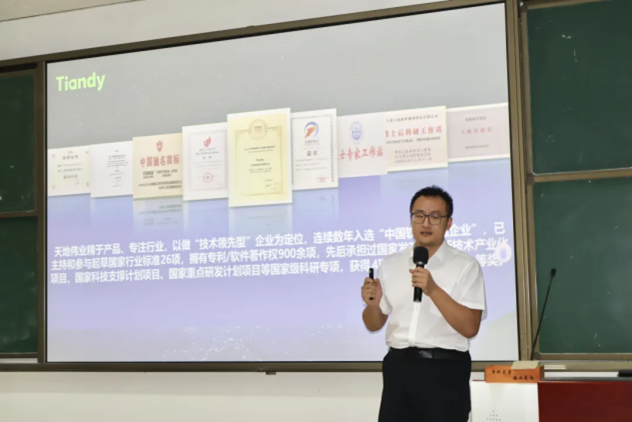宣讲会上,天地伟业技术有限公司欧洲区总经理李小刚通过三个环节,简洁明了地向同学们介绍了企业概况、近几年所取得的成就以及广阔的发展前景。他还从 AK 和 AE 两个项目切入,生动地展示了企业业务与语言专业的高度契合度。