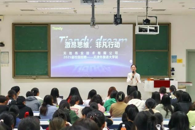 宣讲会前,公司党委书记杨颖与天地伟业领导及招聘负责人进行了亲切会谈。双方特别就今年联合成功申报的天津市产教融合研究生工作站相关合作内容进行深入交流。公司副经理付美艳介绍了研究生工作站进站员工从定岗、选拔、培养以及导师安排等的想法,以及与企业在科研横向课题、课程等方面的合作意向。天地伟业全球业务总经理刘文洁对已入职企业的天外毕业生专业水平和个人综合能力表示肯定,并表示愿大力支持院方工作,加强校企合作,探索高素质复合型人才培养路径。天地伟业人力资源总经理李金竹讲到企业出海就要充分了解当地经济文化,进一步肯定校企横向课题研究的社会价值,表示将积极落实与公司的合作,全力支持研究生工作站工作开展。双方约定将进一步沟通商定合作方案,希望在双方的共同努力下,共赢共促,实现人才供需的良性循环。