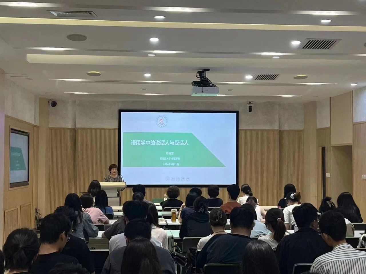 孙淑芳教授从“语用学说略”“言语行为结构要素”“说话人语义范畴”“受话人语义范畴”四个方面展开讲座,她指出,语用学是语言学的一个重要分支,是对语言进行动态描写的一门学科,它将注意力转向研究语言中“人的因素”。言语行为结构要素是语用学研究的重要内容,说话人和受话人范畴是言语行为结构的重要组成部分,二者作为言语主体反映出交际参与人之间的人际关系。紧接着,她通过“说话人与主体范畴”“说话人在语句中的凸显”“说话人与其他语义要素”三方面分析了“说话人语义范畴”,通过“信息性”“生动性”“透明度”概括了“受话人语义范畴”。讲座内容丰富,语言深入浅出,案例鲜活生动,师生互动积极,现场气氛热烈。