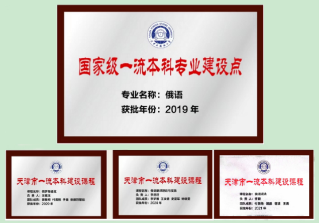 俄语专业创建于1974年,现为国家级一流本科专业建设点,教育部特色专业,天津市品牌专业,天津市重点学科,中俄友好、和平与发展委员会教育理事会理事单位。“基础俄语”教学团队获批天津市级教学创新团队,“俄语翻译理论与实践教学团队”获批天津市级教学团队,“外语研究与语言服务”团队入选天津市“创新团队培养计划”,1门课程入选首批国家级一流本科课程,3门课程入选天津市一流本科建设课程,1门课程入选天津市精品课程,1门课程入选天津市课程思政课程示范课1门课程入选校级课程思政课程,1门课程入选校级一流培育课程。此外,俄语团队荣获天津市特等教学成果奖1项,天津市二等教学成果奖1项,校级一等教学成果奖2项。