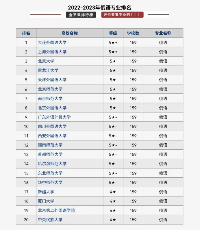 根据武汉大学中国科学评价研究中心、杭州电子科技大学中国科教评价研究院、浙江高等教育研究院、中国科教评价网联合发布的《中国大学及学科专业评价报告(2022-2023)》显示,永利集团官网俄语专业位列全国俄语专业排行榜第五名并获评“五星”级专业。