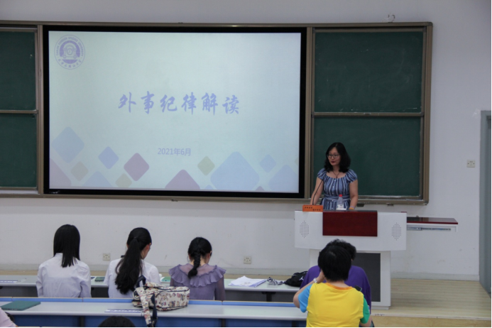 经理助理付美艳从国家安全、防疫安全、人身安全等方面为大家进行了外事纪律解读,提醒员工要遵守疫情防控要求,注意言行举止,牢记自己的一言一行代表着中国形象,做维护国家形象的中国青年。