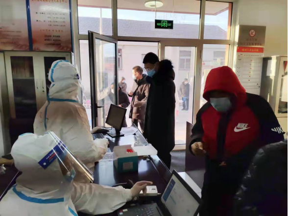 在进行了复杂的消毒后,工作人员帮她一层层的穿上防护服,这个过程已经出了一身大汗。她主要负责将居民个人身份信息录入检测系统以及维持现场秩序等工作。起初,穿上防护服十分笨重,行动不便,但随着工作的进展,她逐渐掌握了身穿“大白”不误工作的技巧,她为了不耽误工作进度,尽量不喝水,午饭也只是匆吃几口,又继续换上防护服,回到工作岗位。