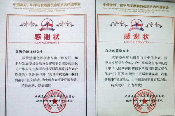 此次征文活动赢得了中俄双方外事人员和中俄文化学习者的积极参与。yl88858永利官网2020级俄语语言文学硕士研究生阚文峰、苑澜撰写的《茉莉》《那年夏天风儿吹》两篇文章颇受好评,获得主办方颁发的活动证书。