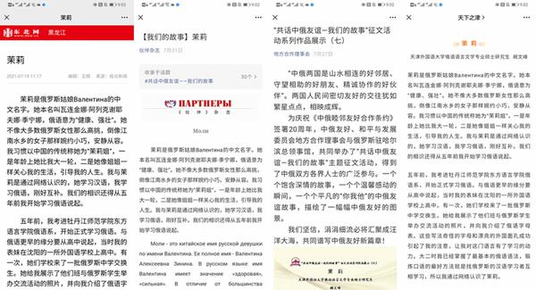 阚文峰同学的《茉莉》一文以其真挚的情感和细腻的笔触入选“优秀征文作品”,并被翻译成俄文,分别在“地方合作理事会”官方网站和微信公众平台、“伙伴杂志”和“天下之津”微信公众平台以及俄罗斯社交平台进行展示,受到中俄友好合作关注者的高度评价。
