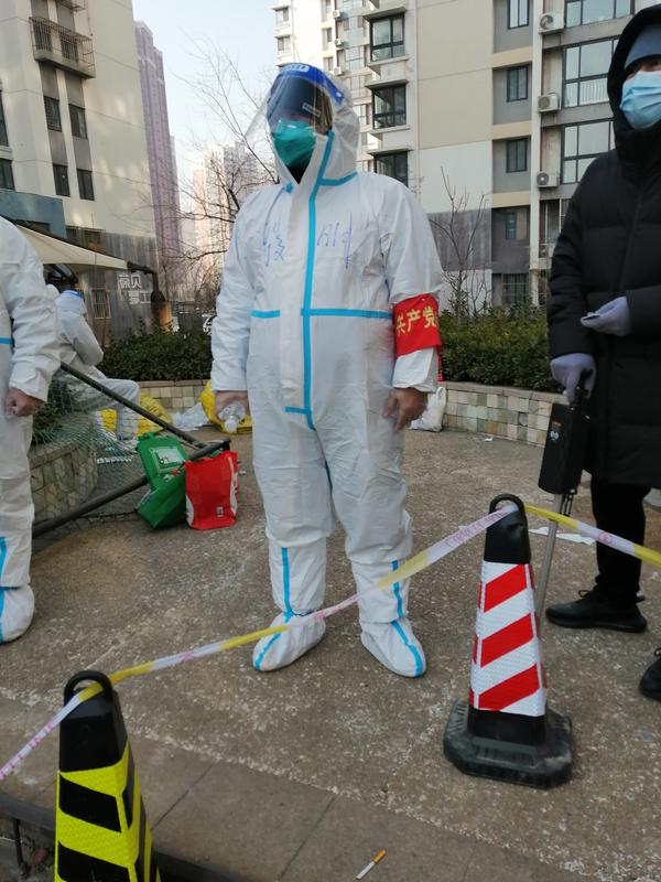 赵石薇、张博通两位党员教师自1月12日起每天到照耀里社区报到,日工作时间达12个小时。1月15日,两位老师又投入到河西区第三次筛查工作中。赵石薇穿上了防护服,变身“大白”,为社区居民、特别是公司的外籍教师进行信息采集工作。辅导员杨春潇在做好每日员工数据统计之余,为照耀里社区服务的老师们送去了装满热水的水瓶暖手,做好服务保障。