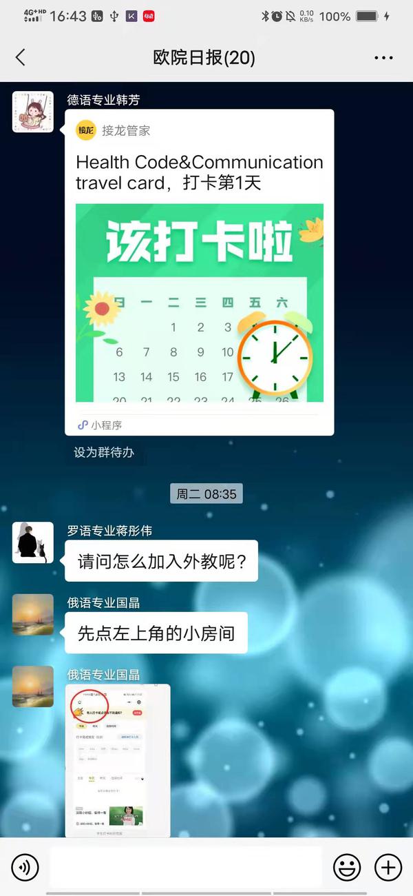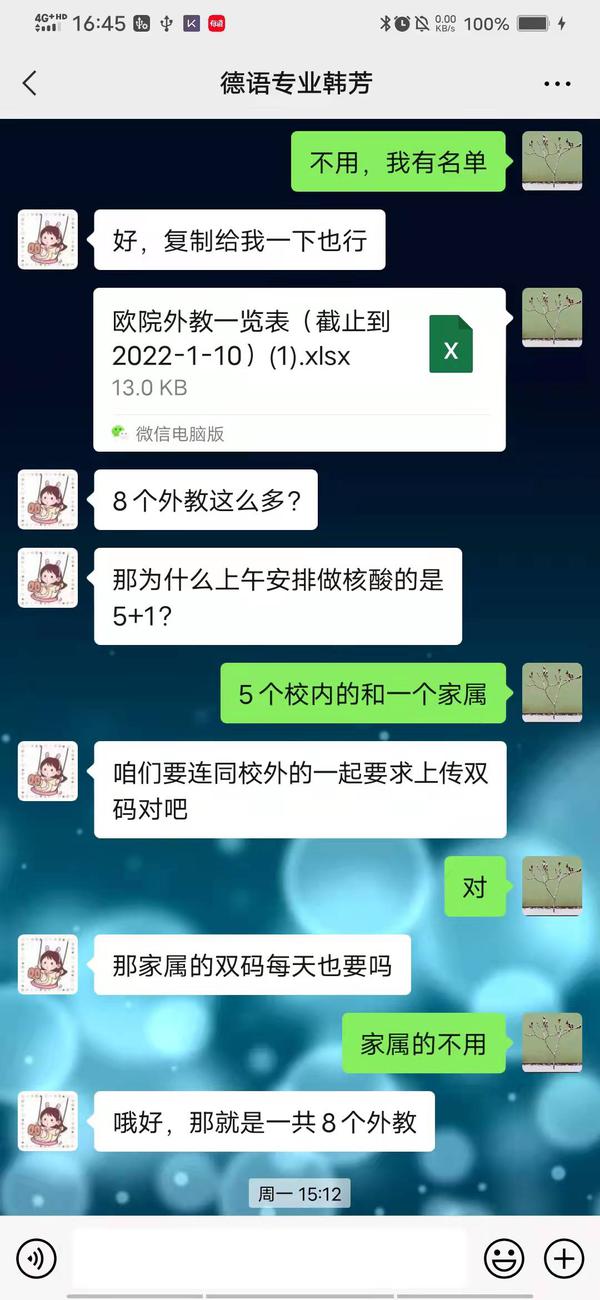 欧院的非通用语种专业多,很多专业负责人还是才走出校门的毕业生,虽然他们人小力单,却扛起了整个专业各方面的工作。2022年1月9日开始,日报数据需要滚动密集上报、不间断更新,而当时日报团队的情况复杂------有的专业负责人被集中隔离,有的专业负责人住在管控区,有的专业负责人无法离津、即将在单身宿舍过第二个新年,日报更换的小程序还需要调试、随时有新的搜集要求、统计口径多样、时间十分紧迫……这种种困难下,欧院日报群内从1月10日起信息热闹滚动,各专业负责人相互协助支持。擅长小程序操作的德语系负责人韩芳老师单独设计外教统计模板,提供给综合办使用,她还热心指导其他专业负责人具体操作。处于管控区、集中隔离点的负责人也毫不含糊,积极配合协助联系在津、境外外教,及时沟通并传递信息,日日准时上报。