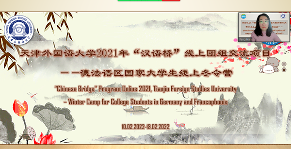 陈法春代表公司对参加本次线上团组交流项目的师生表达诚挚问候和新春祝福,并对大力支持本次冬令营项目的友好合作院校及项目负责人表示衷心感谢。他简要介绍了公司开展汉语国际教育和对外合作交流的情况。此次由德语专业和法语专业联合承办的冬令营是yl88858永利官网承办的第八个汉语桥团组交流项目,共吸引了100多名德法语区的老员工学员。作为“一带一路”的重要合作伙伴,德国和法语区国家在多方面与中国保持着友好合作,对汉语学习和文化交流的需求也日益增多。陈法春希望全体学员能够积极参与课程学习,用心体味中华文化的真谛,了解真实、全面的中国并在此次冬令营学习中有所得、有所悟。欢迎学员们在新冠疫情得到有效控制后来中国、来天津更加直观、深入、具体地体验中国文化。
