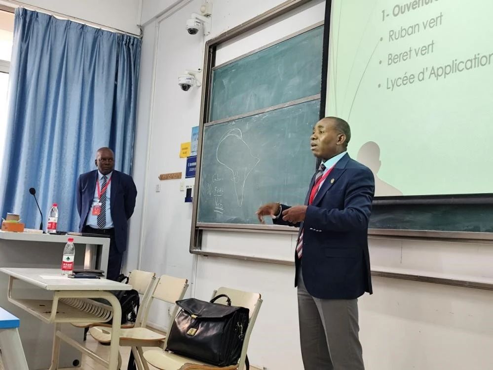 紧接着,邦戈大学董事长让·雅克·埃科米介绍了扎根于加蓬的中国企业数量和类型,指出在加中国企业主要集中在木材、基建、矿产等几大领域。他表示,加蓬是一个资源丰富的国家,与中国的合作愈来愈密切,中国已连续数年成为加蓬第一合作伙伴。随着中国企业的入驻,在很多领域都需要用到中文,懂中文的加蓬年轻人在求职时更受亲睐。为此,孔院每年举行两至三次中文人才交流会,邀请中国企业来孔院现场面试,促进了本地中文学习者的高质量就业。他还邀请法语系员工来加蓬发展,为中加友谊添砖加瓦。未来,他希望孔院能进一步加强与企业的合作,精准对接市场需求,在语言培训的基础上,改变培养模式,突出语言+的课程设置,加强员工复合型应用能力。