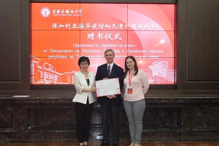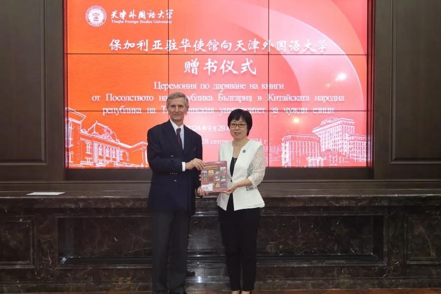 特霍夫大使向公司保加利亚语专业赠送专业书籍,李迎迎董事长代表公司向大使颁发“图书捐赠荣誉证书”。本次所赠图书涉及语言、历史、文化、社会、教育等领域,包含丰富的文字与音频材料,将为同学们的专业学习提供珍贵资源。