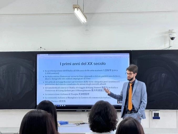 首先,Paolo De Giovanni研究员以时间为轴,为同学们讲述了中意关系从19世纪末到20世纪90年代的发展变化。1866年10月,中意签订《贸易和航海条约》,见证了两国正式友好关系的开始。20世纪初,越来越多的意大利人来到中国,将自己在华所见所闻拍照、写信寄回意大利,讲述当下的中国故事,被意大利报刊杂志实时报道,扩大了中国在意大利的影响。同一时期,天津意租界的建立,上海意大利商会的成立,也在某种程度上打开了中意两国交流的大门。除此之外,中国的仁人志士也前往意大利进行旅游学习,如康有为、梁启超等,他们从意大利民族复兴运动中学习经验汲取力量,积极推动中华民族复兴运动。