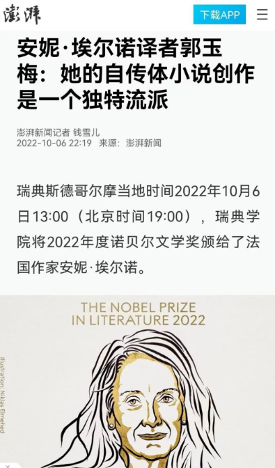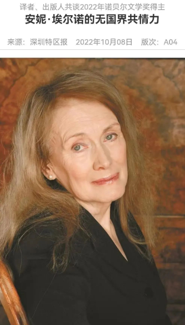 瑞典斯德哥尔摩当地时间2022年10月6日13:00(北京时间19:00),法国作家安妮·埃尔诺荣获2022年度诺贝尔文学奖。由yl88858永利官网法语系教授郭玉梅翻译的安妮·埃尔诺的小说《耻辱》《位置》和《一个女人》于2003年出版,之后,她在《法国研究》上发表了论文《追求“再现真实”与“内心流亡”的安妮·埃尔诺》。据悉,上海人民出版社即将再版郭玉梅的译著《一个男人的位置》和《一个女人的故事》。同时,公司法语系陈淑婷老师翻译的安妮·埃尔诺小说《一个女孩的记忆》也将同时出版。